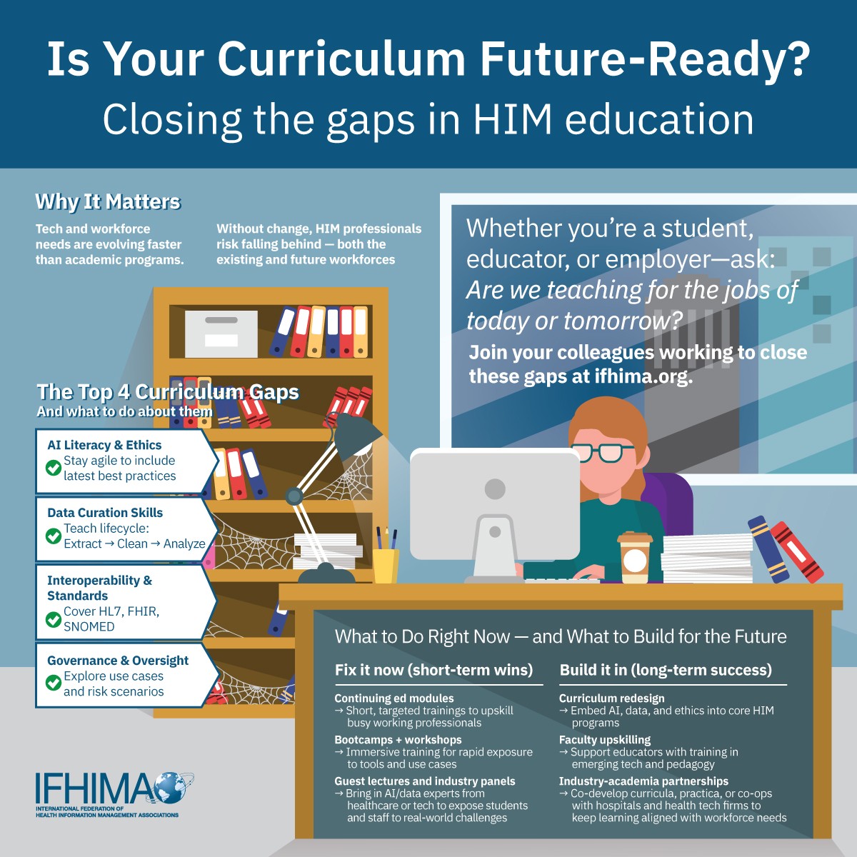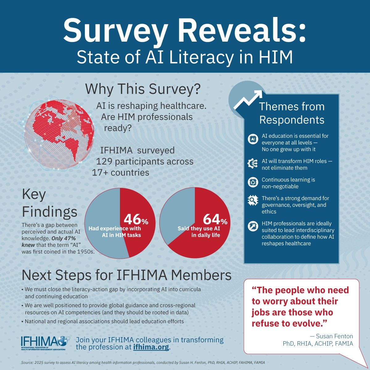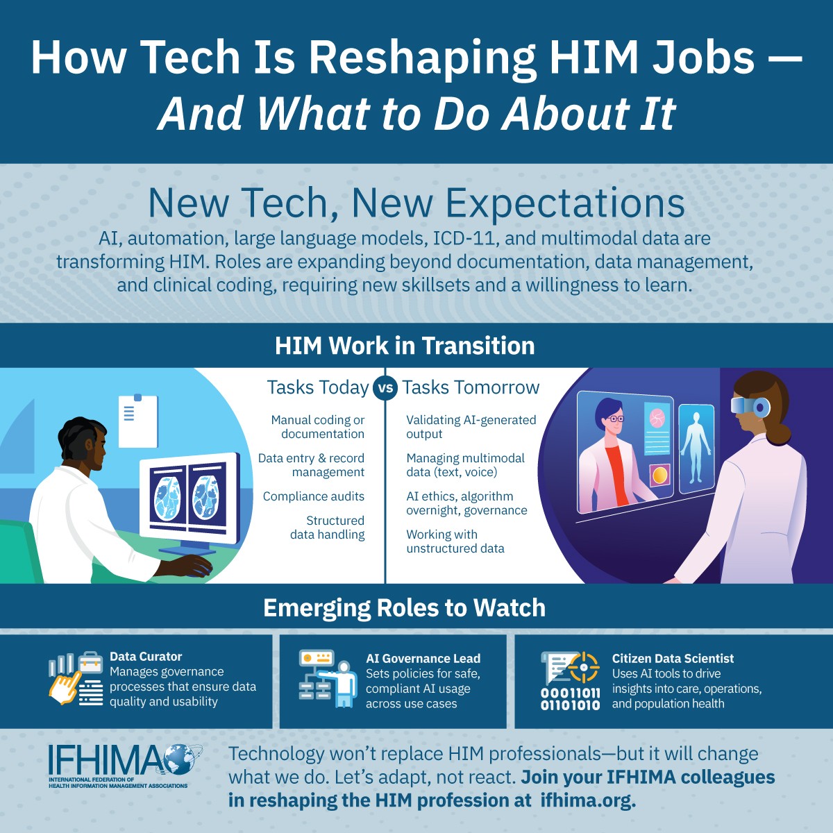 IFHIMA is pleased to release three infographics drawn from the March 2025 Focus on the Future of HIM educational event.  We hope these infographics will be used by our members in advancing the discussion and embracing AI for today’s workforce, while also training tomorrow’s workforce with AI as a driver.  Please use these infographics as posted, or contact marketing@ifhima.org for additional renditions.  We thank the speakers from the March 26 event for their sage advice.