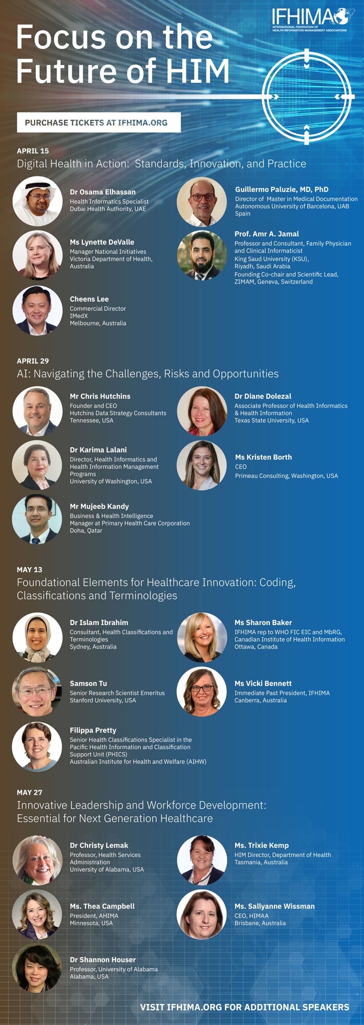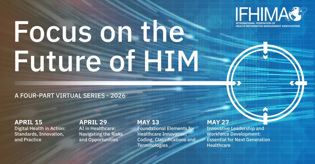IFHIMA is delighted to open ticket sales for the 2026 Focus on the Future of HIM virtual series. This series follows our very successful 2025 approach with changes reflecting feedback from attendees and speakers. Each virtual event includes three speakers and a panel discussion.
